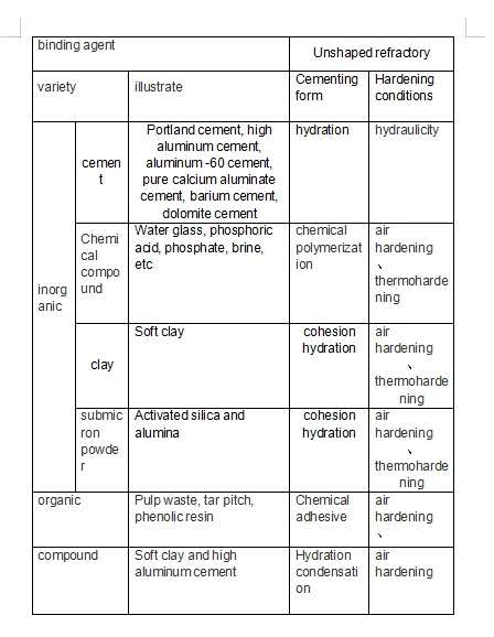 According to the type of binder, operation method and aggregate classification,unshaped refractory can be divided into the following.