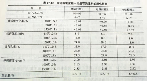 The particle size composition of ordinary high aluminum-spinel castable aggregate can be adjusted according to Andreassen's particle size distribution equation. The particle size distribution coefficient q is controlled between 0.26 and 0.35. The content of spinel was between 10% and 15%, some of which were added with 3~1mm particles and some with powder less than 0.074mm. The chemical properties of the general high alumina - spinel casting are shown in table 17-11.